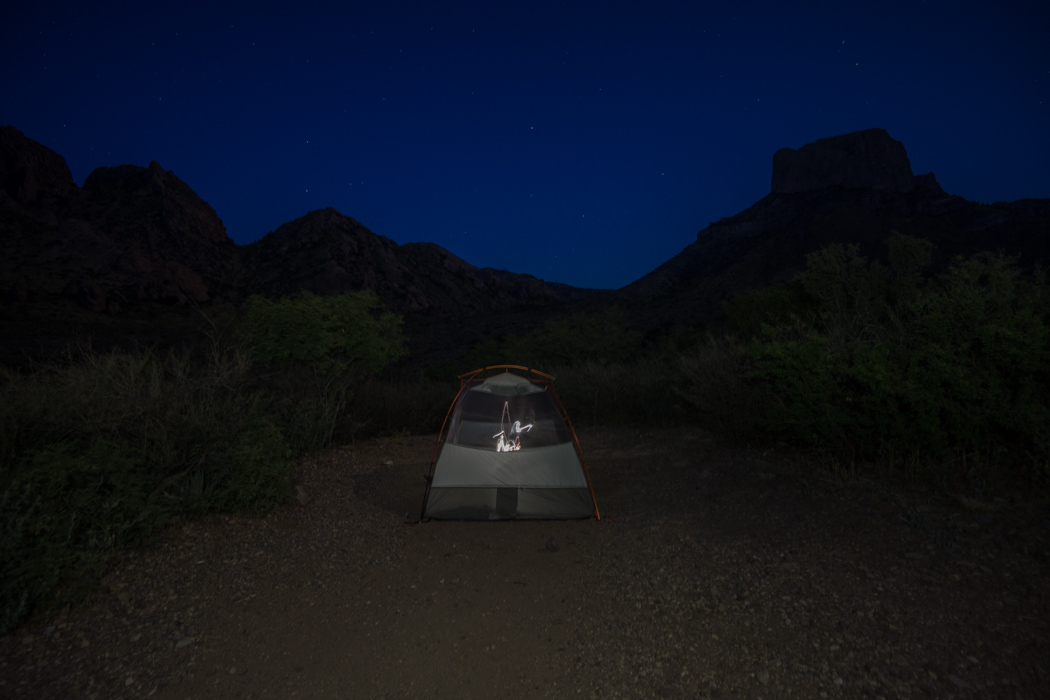 Après avoir fait 3 fois le tour du camping, on choisit un emplacement relativement isolé, face aux montagnes. Le ranger nous dit qu’on risque de croiser des ours. C’est toujours la même oscillation entre super un teddy bear et merde on va mourir au Texas. On installe la tente – une nouvelle tente plus grande que celle des années précédentes (faudra que je vous reparle de notre matos), sans installer le toit, histoire de voir le beau ciel étoilé – et éventuellement la tête de l’ours imaginaire surgir à tout moment. Il y a très peu de pollution lumineuse par ici, on peut bien voir les étoiles et même la Voie Lactée. Cela dit, ne pas mettre le toit est une erreur de débutant : quand la lune se lève, elle nous éblouit et illumine la tente façon néon de cuisine à 2h du mat.