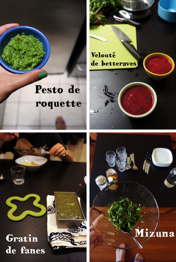 Mais on a pris de bonnes résolutions : ne rien jeter de la boîte CSA. Ca fait un peu « Mamie Lucette fait des économies », mais parfois ça nous arrive d’avoir un frigo plein et de laisser tout lentement se périmer parce qu’on mange jamais chez nous. Et ça, c’est pas cool. Du coup, on essaie de prendre soin de nos légumes comme d’un petit trésor. Même les fanes des légumes, d’habitude promises à un destin radical (le broyeur à légumes de l’évier), se sont réincarnées dans une recette…