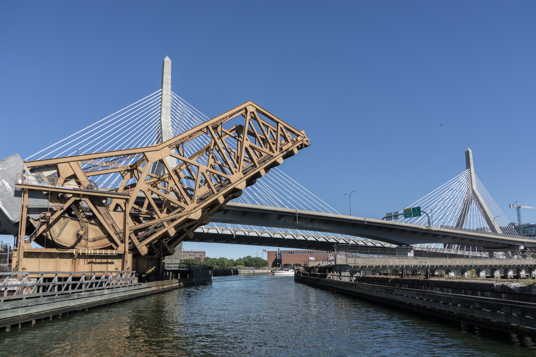 Chouette vue sur un pont à bascule (on dit vraiment « bascule » en anglais !) et derrière le Zakim Bridge