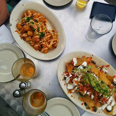 Il y a un avant, et un après nachos. Imaginez un tas de chips tortillas,  des haricots noirs, des bouts de tomate (pour la version saine – c’est facultatif), le tout recouvert de fromage élastique semi-liquide, le Velveeta, de crème fraîche ou de guacamole. Ça se sert chaud, on peut ajouter du porc effiloché (pulled pork)Attention : tous les nachos ne se valent pas. Victoire suprême : la serveuse du bar où j’aime sortir sait comment j’aime mes nachos. Sur la photo, combinaison de nachos + guac et d’un plat de tater tots, des sortes de pommes noisettes cheap.