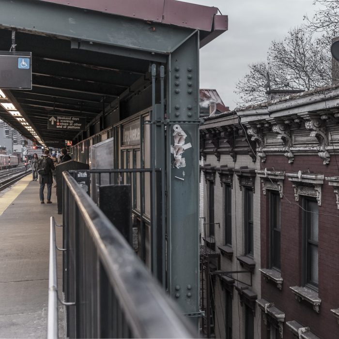 (5) On longe Myrtle Avenue : cette large rue traverse tout Brooklyn. En quelques kilomètres, on traverse différents quartiers, qui se ressemblent architecturalement parlant – ce sont surtout des immeubles bas. On passe d’un quartier afro-américain, à un quartier latino, puis un quartier juif orthodoxe – Crown Heights. La transition est brutale quand on arrive dans le downtown de Brooklyn : nous voilà dans un centre-ville américain classique.