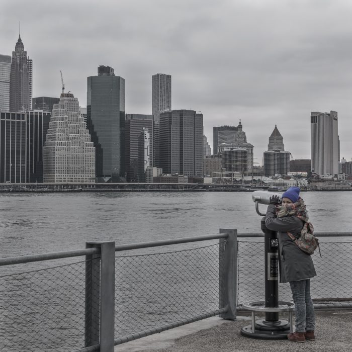 (7) On passe sous un périphérique, et on arrive au bord de l’eau, c’est l’East River de ce côté. Il fait un froid de pouilleux, heureusement je suis couverte comme en plein hiver de Nouvelle Angleterre – no style pour moi, mais je suis cozy. On voit la statue de la Liberté tout au loin, la vue sur Manhattan en face. Manu me propose 10,000 dollars si je traverse à la nage. Je refuse. On marche dans le Brooklyn Bridge Park.