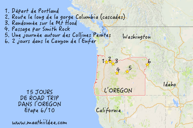 Notre but de la journée est d’arriver au Canyon de l’Enfer, Hells Canyon. Voici à quoi ressemble les différentes étapes de notre road trip dans l’Oregon depuis qu’on est parti, 5 jours plus tôt :