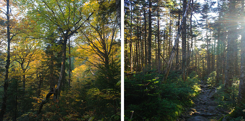 Arrivés tout la haut, sur la crête de la Presidential Range (la chaîne des Présidents : tous les sommets ont des noms d’anciens présidents des Etats-Unis) on avait une vue panoramique sur toute la vallée : on aurait dit un tapis tout doux aux couleurs automnales.
