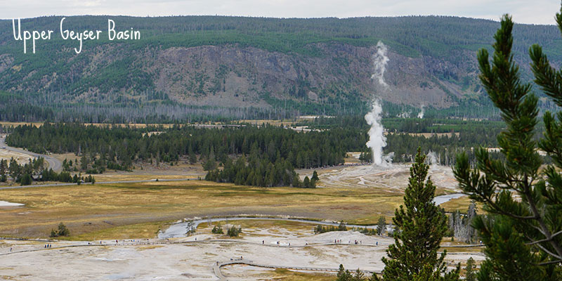 Old Faithful est l’un des geysers les plus célèbres pour celui qui visite Yellowstone, ce n’est pas le plus haut ou le plus fou, mais il est régulier depuis de nombreuses années, d’où son nom qui veut dire le « vieux fidèle » car il explose toutes les 90 minutes. C’est le premier geyser qu’on est allé voir, qui est en fait situé dans un bassin, l’Upper Geyser Basin, qui compte 75 geysers et 600 sources chaudes. Pour l’info inutile : il y a deux types de geysers, en fonction de leur forme : fontaine ou cône. Et Old Faithful est un geyser en cône.